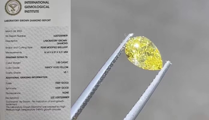 Diamante per pere, giallo vivace, VS1, eccellente, certificato IGI